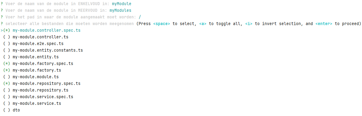 When you start the module generator it prompts you with a few questions, first it will ask you to enter the module name in singular and plural form. Then you can select all files and folders you want to generate. When you have entered all the information it will generate the module.